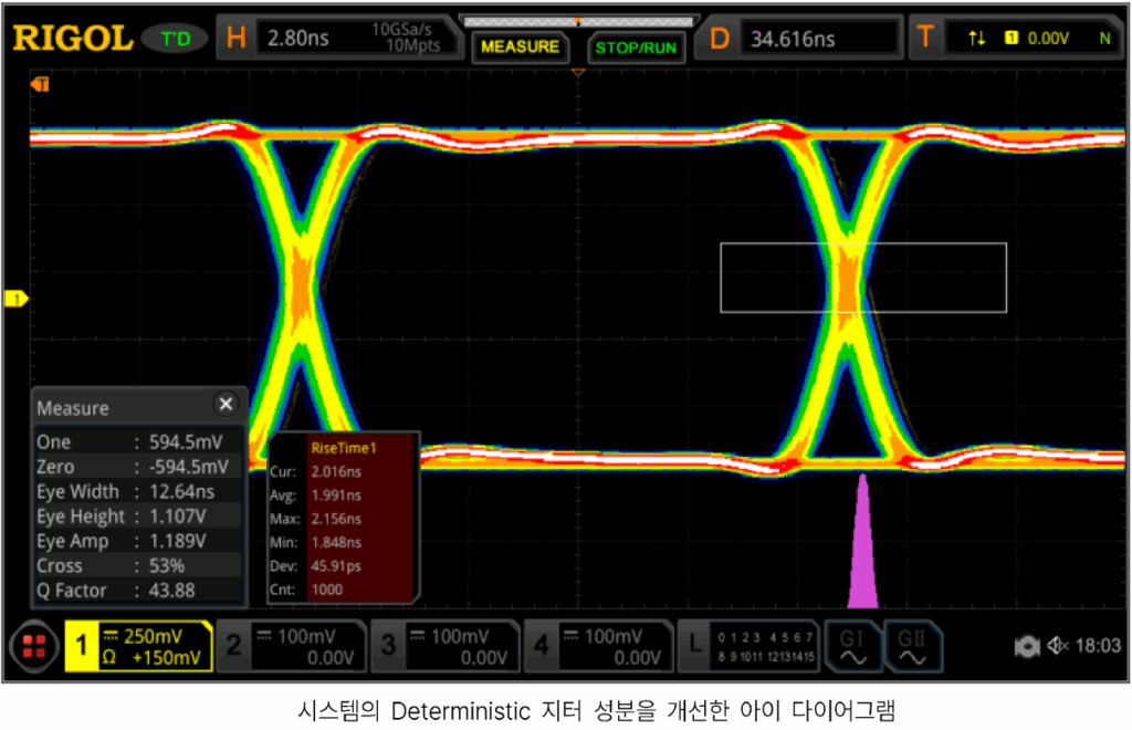 - 대역폭 최적화: 대역폭 제한 요소를 제거하여 엣지를 가파르게 세우면 비트 오류율(BER)이 낮아진 완전히 열린 아이 패턴이 형성됩니다.
